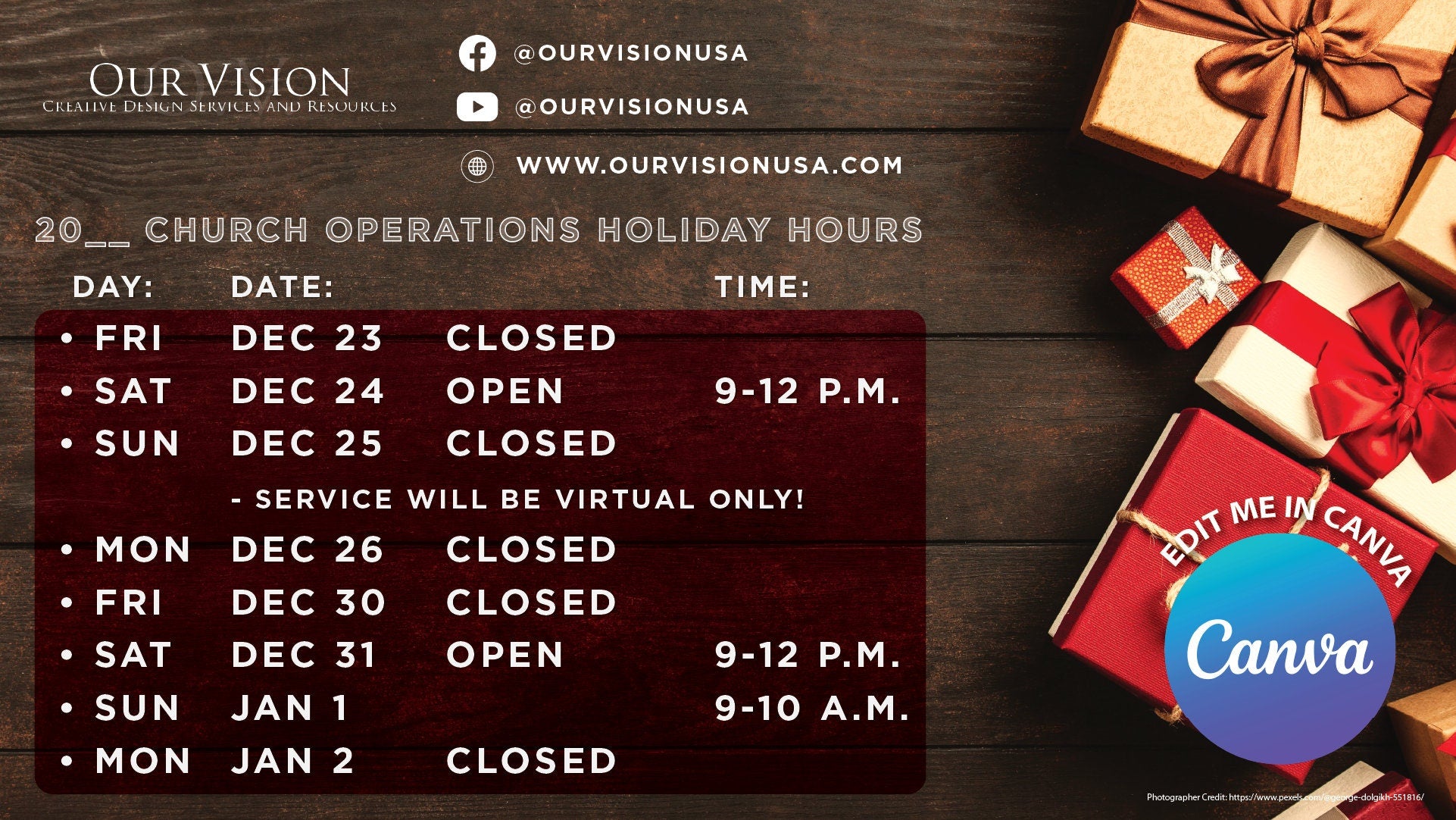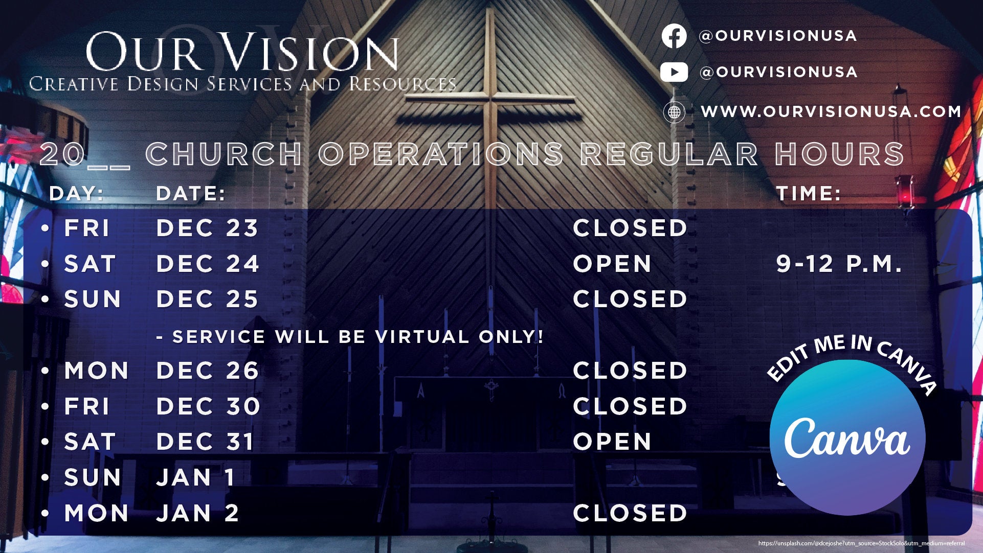 Title: Church Hours of Operation Calendar - Editable Canva Template
