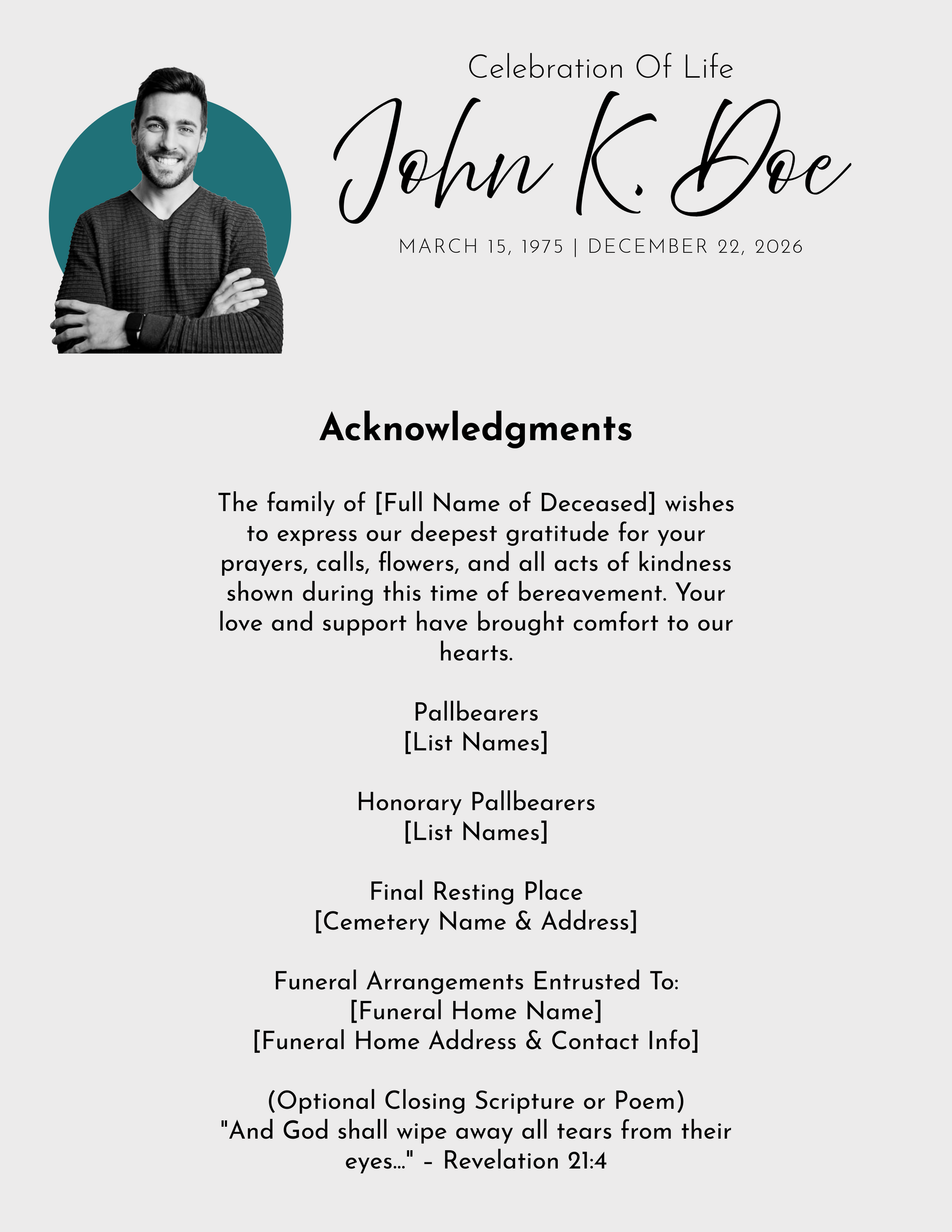 Includes: Name, dates, short obituary, scripture/quotes, and service order