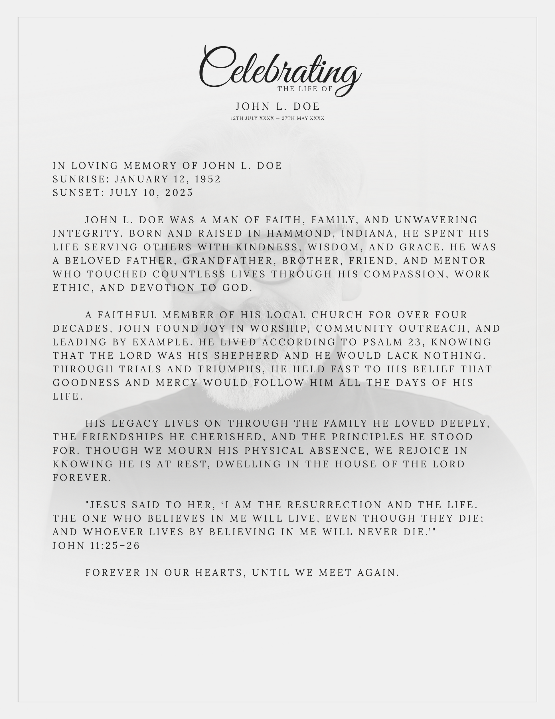 ✅ 4-Page 8.5" x 11" Funeral Brochure (Cover, Obituary, Service Order, Reflections)